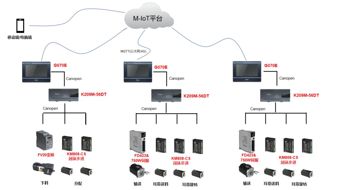 客戶和設(shè)備商擔(dān)心的就是設(shè)備故障停機(jī),升級版口罩機(jī)Plus方案通過互聯(lián)網(wǎng)或4G將整套設(shè)備接入云端的M-IoT平臺,讓設(shè)備上云,足不出戶就可實(shí)現(xiàn)設(shè)備遠(yuǎn)程診斷,實(shí)現(xiàn)故障及時排查與預(yù)防性維護(hù)。通過對驅(qū)動器、電機(jī)、變頻器、PLC、HMI的運(yùn)行數(shù)據(jù)采集,完成對設(shè)備運(yùn)行健康狀態(tài)的監(jiān)控。