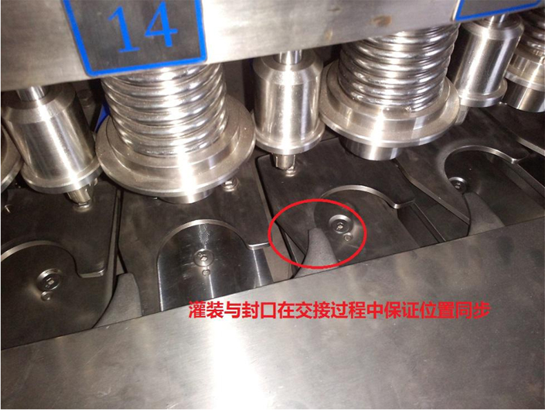 2、在運行過程中始終保持工位一一對應,實現灌裝機和封口機位置同步,保證灌裝與封口環(huán)節(jié)的平滑交接,不影響罐內液體容量偏差和保證罐體外形完好無損
