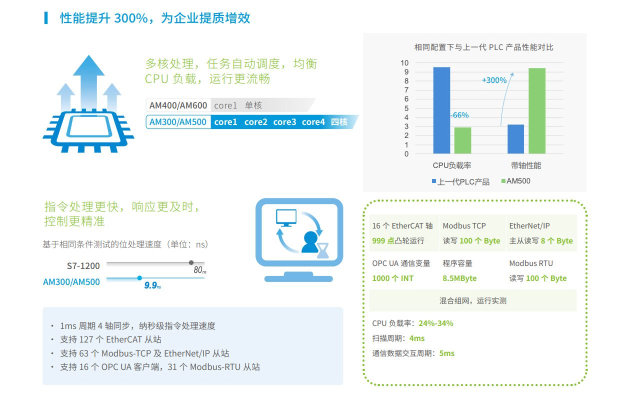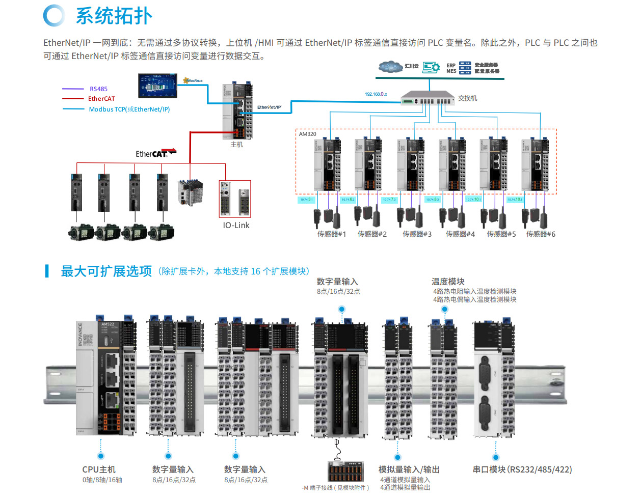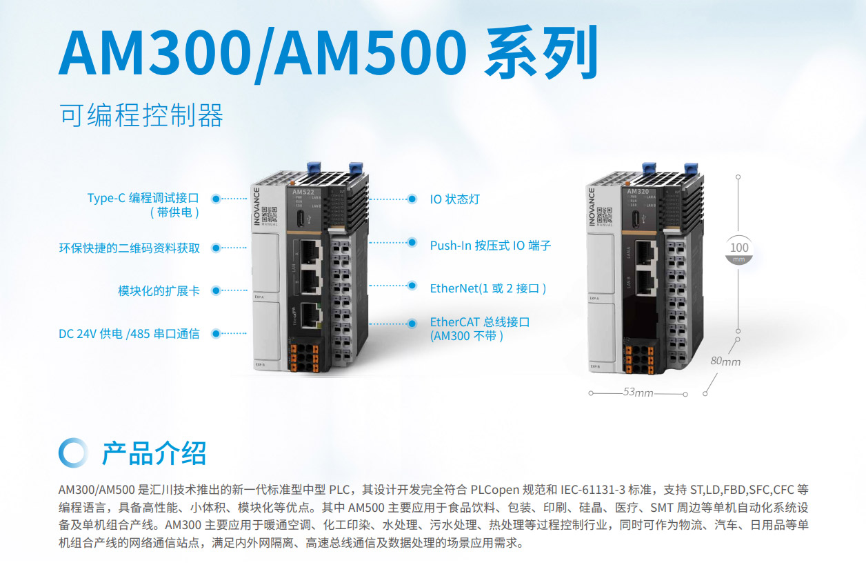 AM300系列是匯川技術(shù)推出的新一代中型PLC,其設(shè)計(jì)開(kāi)發(fā)完全符合PLCopen規(guī)范和IEC-61131-3標(biāo)準(zhǔn),支持ST,LD,SFC,CFC等編程語(yǔ)言,具備高性能、小體積、模塊化等優(yōu)點(diǎn)。集成如EtherNet/IP、OPC UA、Modbus TCP(支持兩路不同網(wǎng)段的IP地址)、TCP/IP、RS485(最大可擴(kuò)展至3路)、CAN總線等全球標(biāo)準(zhǔn)工業(yè)網(wǎng)絡(luò)。主要應(yīng)用于暖通空調(diào)、化工印染、水處理、污水處理、熱處理等過(guò)程控制行業(yè),同時(shí)可作為物流、汽車、日用品等單機(jī)組合產(chǎn)線的網(wǎng)絡(luò)通信站點(diǎn),滿足內(nèi)外網(wǎng)隔離、高速總線通信及數(shù)據(jù)處理的場(chǎng)景應(yīng)用需求。其開(kāi)發(fā)編程平臺(tái)InoProShop覆蓋從多軸復(fù)雜應(yīng)用、離散單機(jī)應(yīng)用到基本邏輯應(yīng)用,可搭載匯川技術(shù)基于ISA88標(biāo)準(zhǔn)開(kāi)發(fā)的InoQuickPro標(biāo)準(zhǔn)化編程模板框架,實(shí)現(xiàn)規(guī)范的標(biāo)準(zhǔn)化管理開(kāi)發(fā),降低人才培訓(xùn)成本。