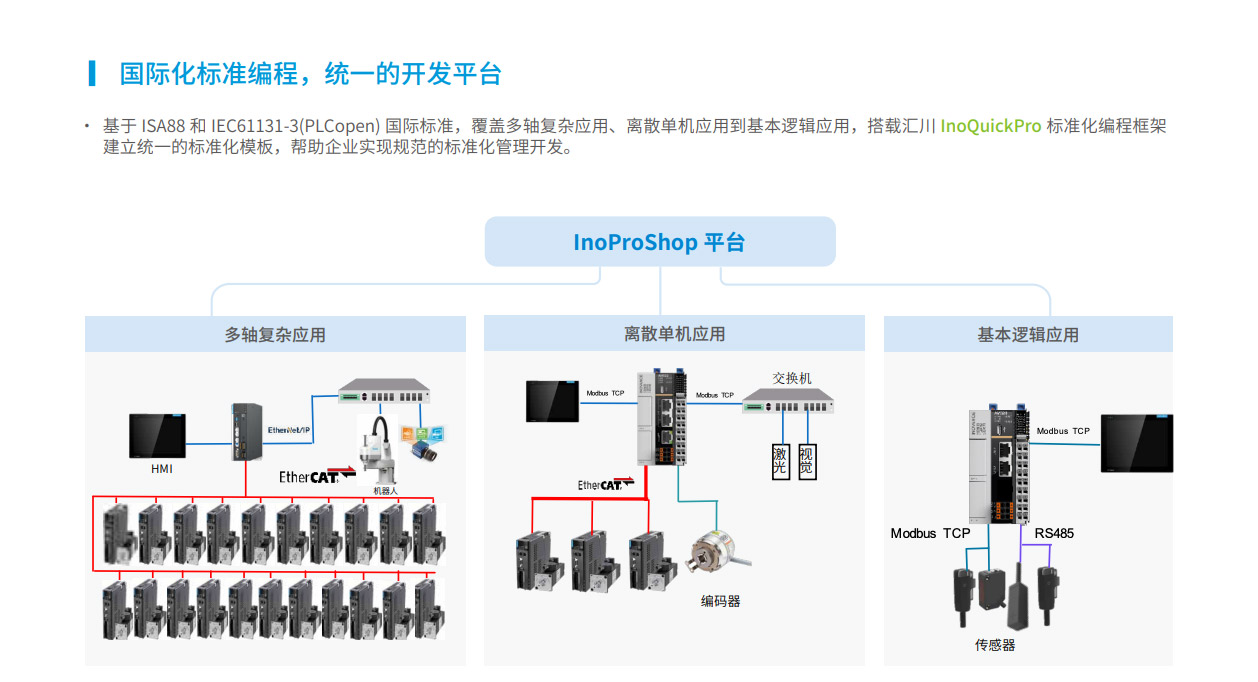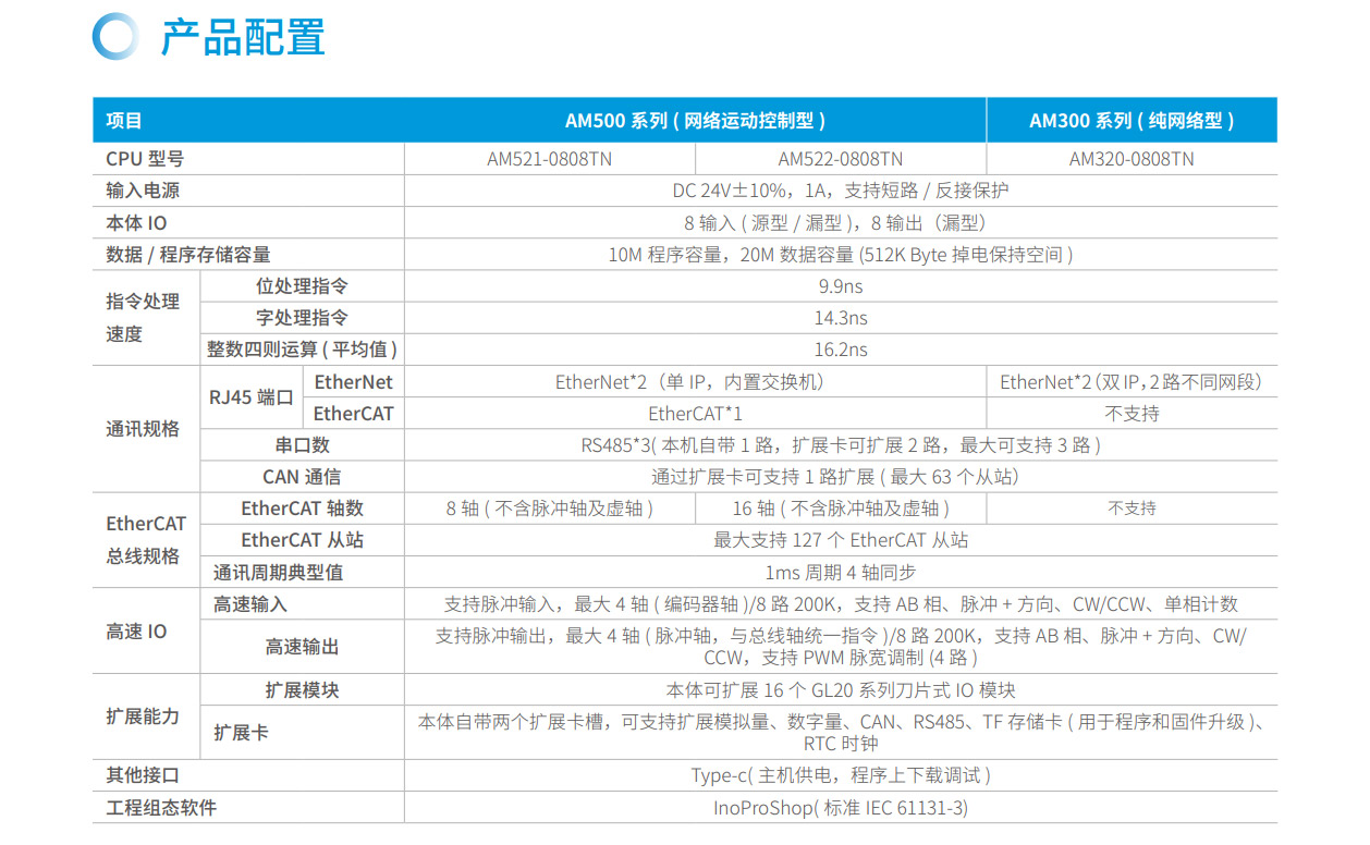 AM500系列是匯川技術(shù)推出的新一代標(biāo)準(zhǔn)型中型PLC,其設(shè)計(jì)開(kāi)發(fā)完全符合PLCopen規(guī)范和IEC-61131-3標(biāo)準(zhǔn),支持ST,LD,SFC,CFC等編程語(yǔ)言,以其小巧的CPU體積、模塊化靈活組合及高節(jié)拍生產(chǎn)特性可適應(yīng)更多的應(yīng)用場(chǎng)景。支持EtherCAT、EtherNet/IP、OPC UA、Modbus TCP(支持兩路同一網(wǎng)段的IP地址)、TCP/IP、RS485(最大可擴(kuò)展至3路)、CAN總線等全球標(biāo)準(zhǔn)的工業(yè)網(wǎng)絡(luò)。主要應(yīng)用于食品飲料、包裝、印刷、硅晶、醫(yī)療、SMT周邊等單機(jī)自動(dòng)化設(shè)備及單機(jī)組合產(chǎn)線,滿足生產(chǎn)效率及控制精度提升場(chǎng)景需求。其開(kāi)發(fā)編程平臺(tái)InoProShop覆蓋從多軸復(fù)雜應(yīng)用、離散單機(jī)應(yīng)用到基本邏輯應(yīng)用,可搭載匯川技術(shù)基于ISA88標(biāo)準(zhǔn)開(kāi)發(fā)的InoQuickPro標(biāo)準(zhǔn)化編程模板框架,實(shí)現(xiàn)規(guī)范的標(biāo)準(zhǔn)化管理開(kāi)發(fā),降低人才培訓(xùn)成本。