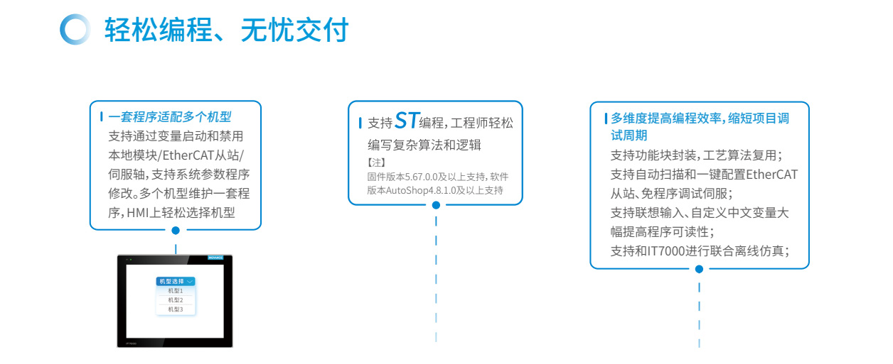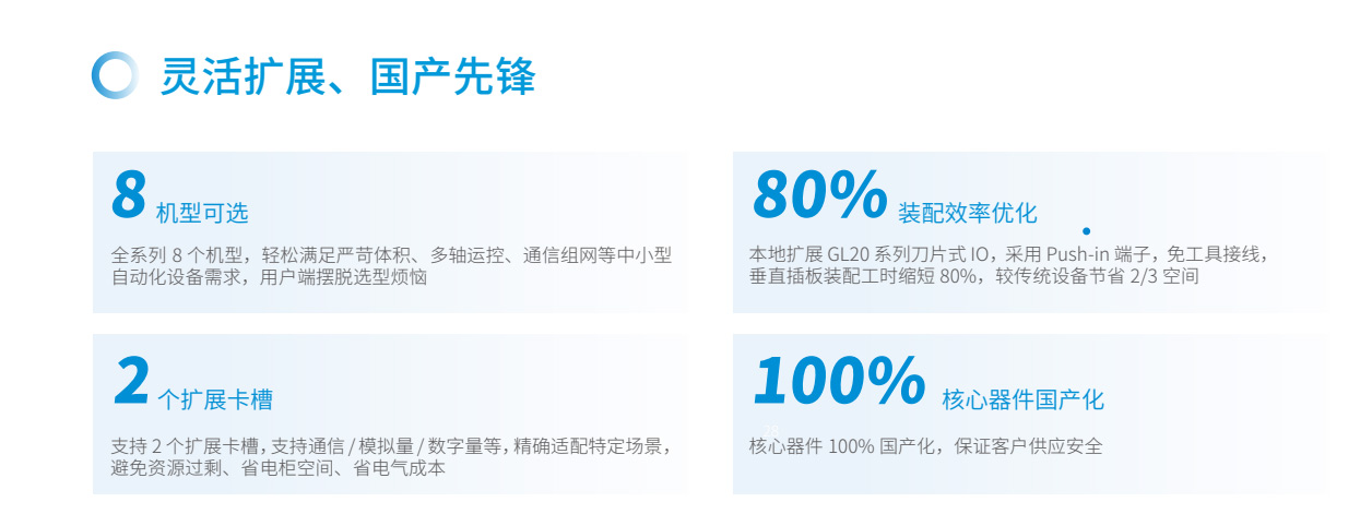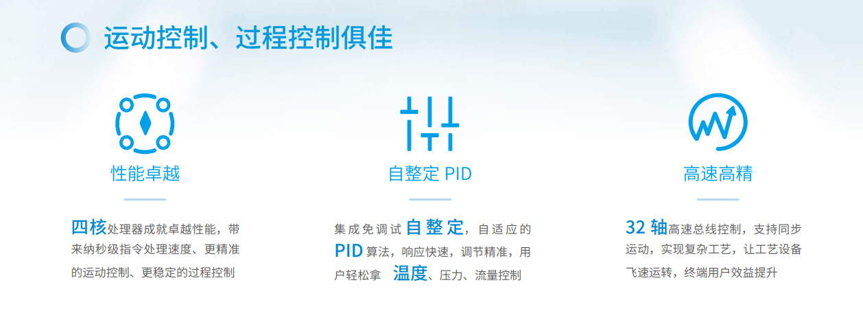易實現(xiàn)運動控制、過程控制易選型、易擴展易互聯(lián)、易組網(wǎng)易編程、模塊化易交付、100%核心器件國產(chǎn)化