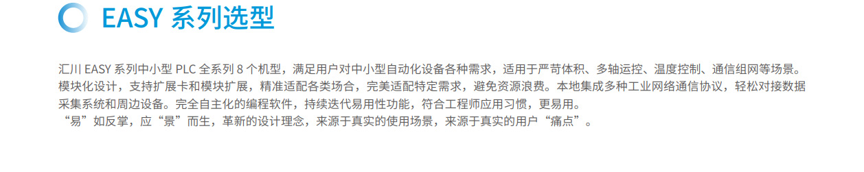 匯川EASY系列全場景緊湊型中小型控制器全系列8個機型,滿足用戶對中小型自動化設備各種需求,適用于嚴苛體積、多軸運控、溫度控制、通信組網(wǎng)等場景。機身模塊化設計,支持擴展卡和模塊擴展,精準適配各類場合,完美適配特定需求,避免資源浪費。本地集成多種工業(yè)網(wǎng)絡通信協(xié)議,輕松對接數(shù)據(jù)采集系統(tǒng)和周邊設備。完全自主化的編程軟件,持續(xù)迭代易用性功能,符合工程師應用習慣,更易用。 “易”如反掌,應“景”而生,革新的設計理念,來源于真實的使用場景,來源于真實的用戶“痛點”。