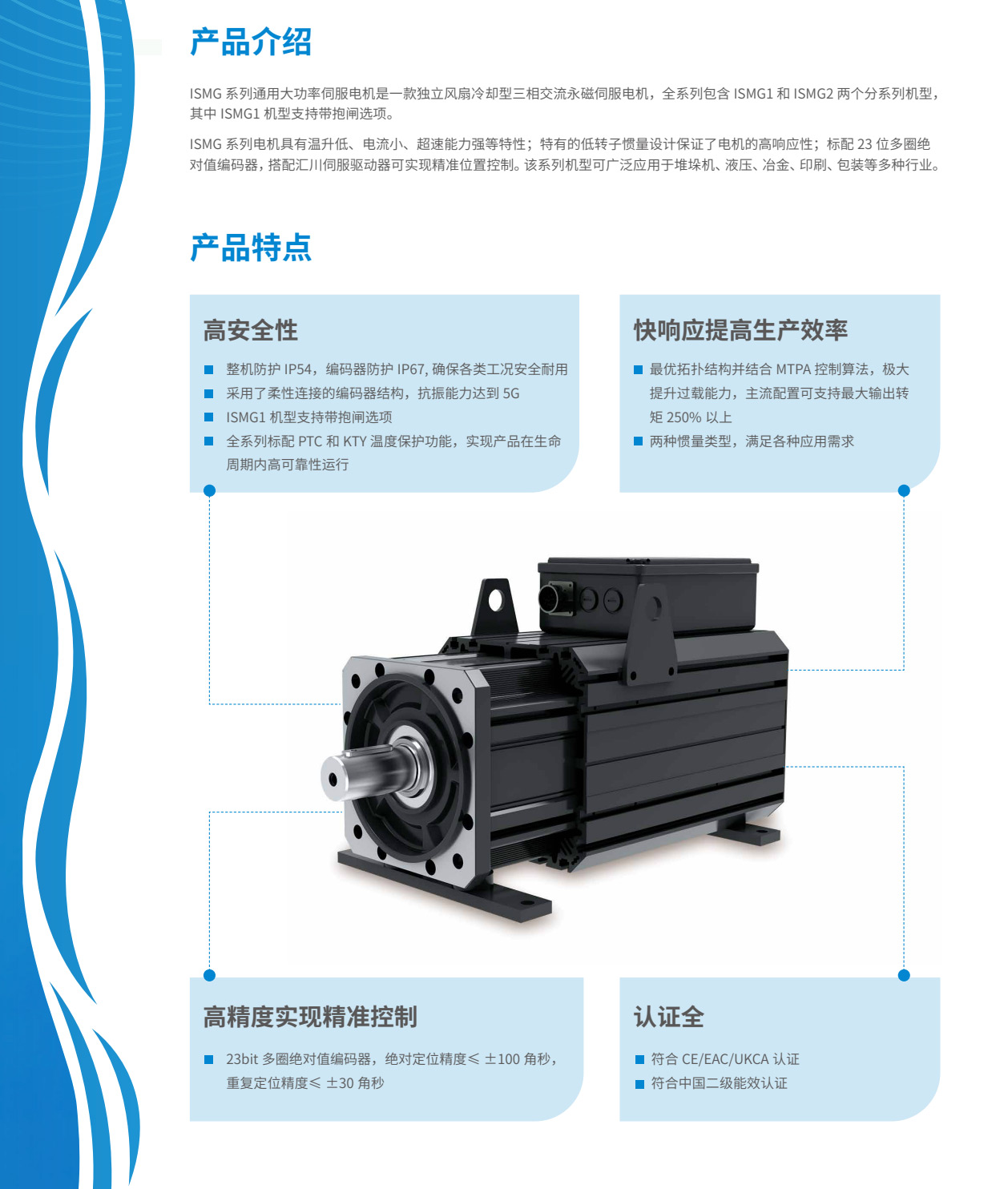 ISMG系列伺服電機(jī)產(chǎn)品,功率覆蓋7.5 kW ~ 80 kW、標(biāo)配23 位絕對值編碼器;產(chǎn)品的IP54 防護(hù)等級設(shè)計(jì)、耐沖擊振動(dòng)的編碼器結(jié)構(gòu)設(shè)計(jì)保證了產(chǎn)品可以覆蓋絕大多數(shù)工業(yè)場合的應(yīng)用;獨(dú)特的電磁設(shè)計(jì)及風(fēng)冷回路設(shè)計(jì)、內(nèi)置熱保護(hù)器,實(shí)現(xiàn)了產(chǎn)品在生命周期內(nèi)高可靠性運(yùn)行;ISMG1系列亦可加裝150 N·m 制動(dòng)扭矩的制動(dòng)器。