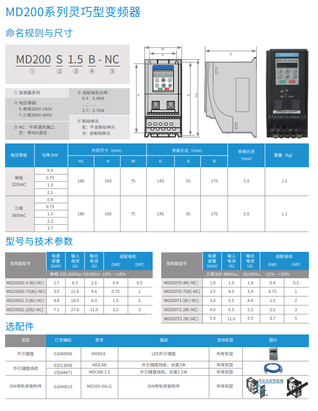 MD200系列緊湊型變頻器是匯川技術(shù)基于小功率、小體積、低成本的市場需求,針對性推出的單相220 VAC 和三相380 VAC 迷你變頻器。MD200 采用V/F 控制方式、無速度傳感器矢量控制方式(SVC),具有高功率密度、高EMC 規(guī)格設(shè)計、高防護(hù)性能等顯著優(yōu)勢。